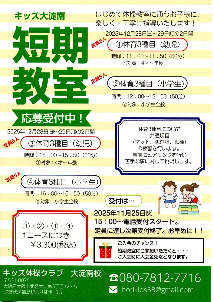 キッズ体操クラブは2025年11月に新しく開校することになりました。